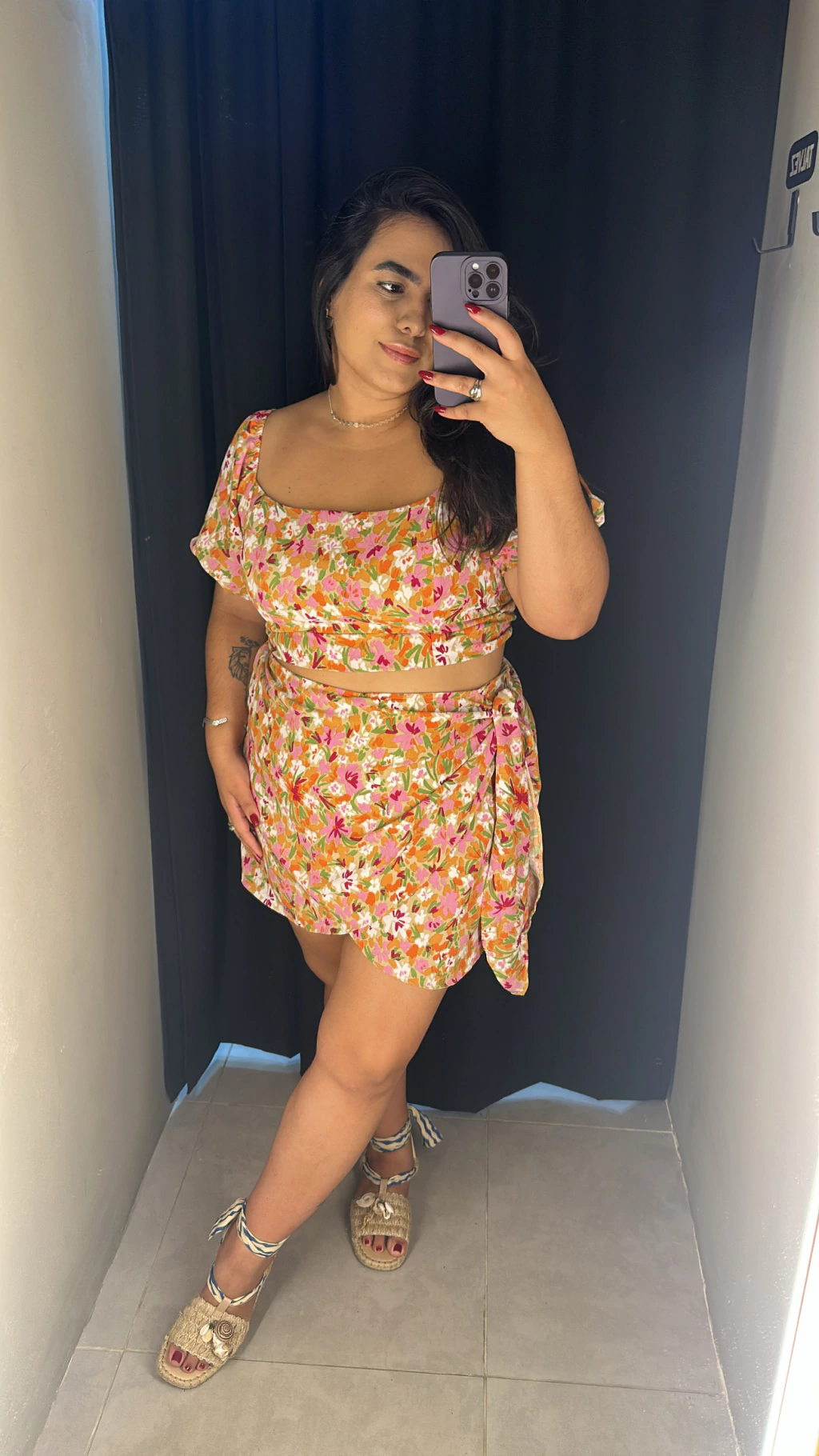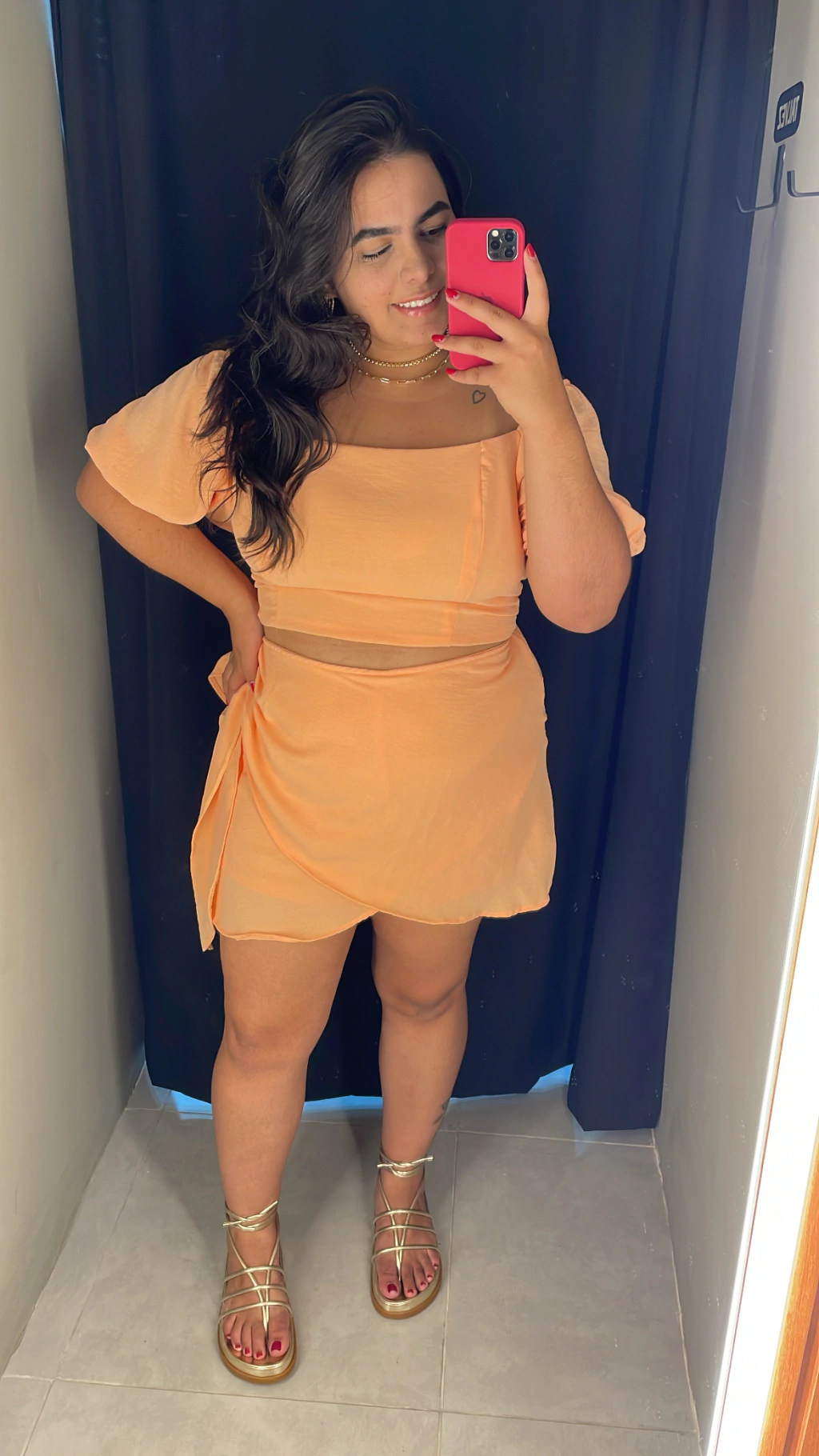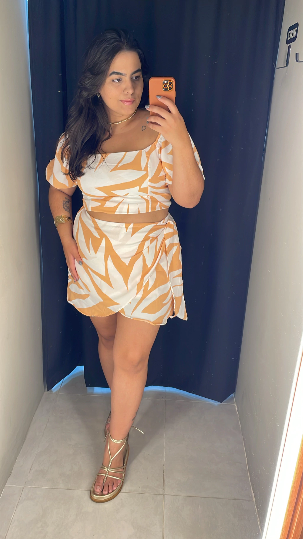 Nosso conjunto de short saia e cropped é confeccionado no tecido de crepinho de seda, não possui elastano, não encolhe e não amarrota. Possui elástico na parte de trás da saia para melhor se adaptar ao corpo, e o croped é de amarrar atrás, sendo ajustável. Está disponível em três numerações, são elas: