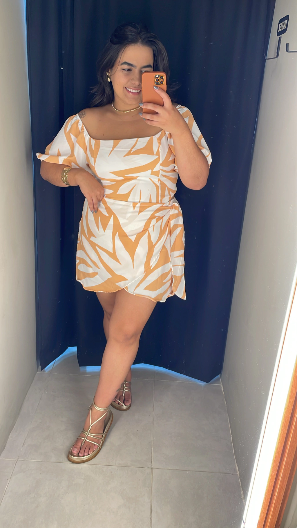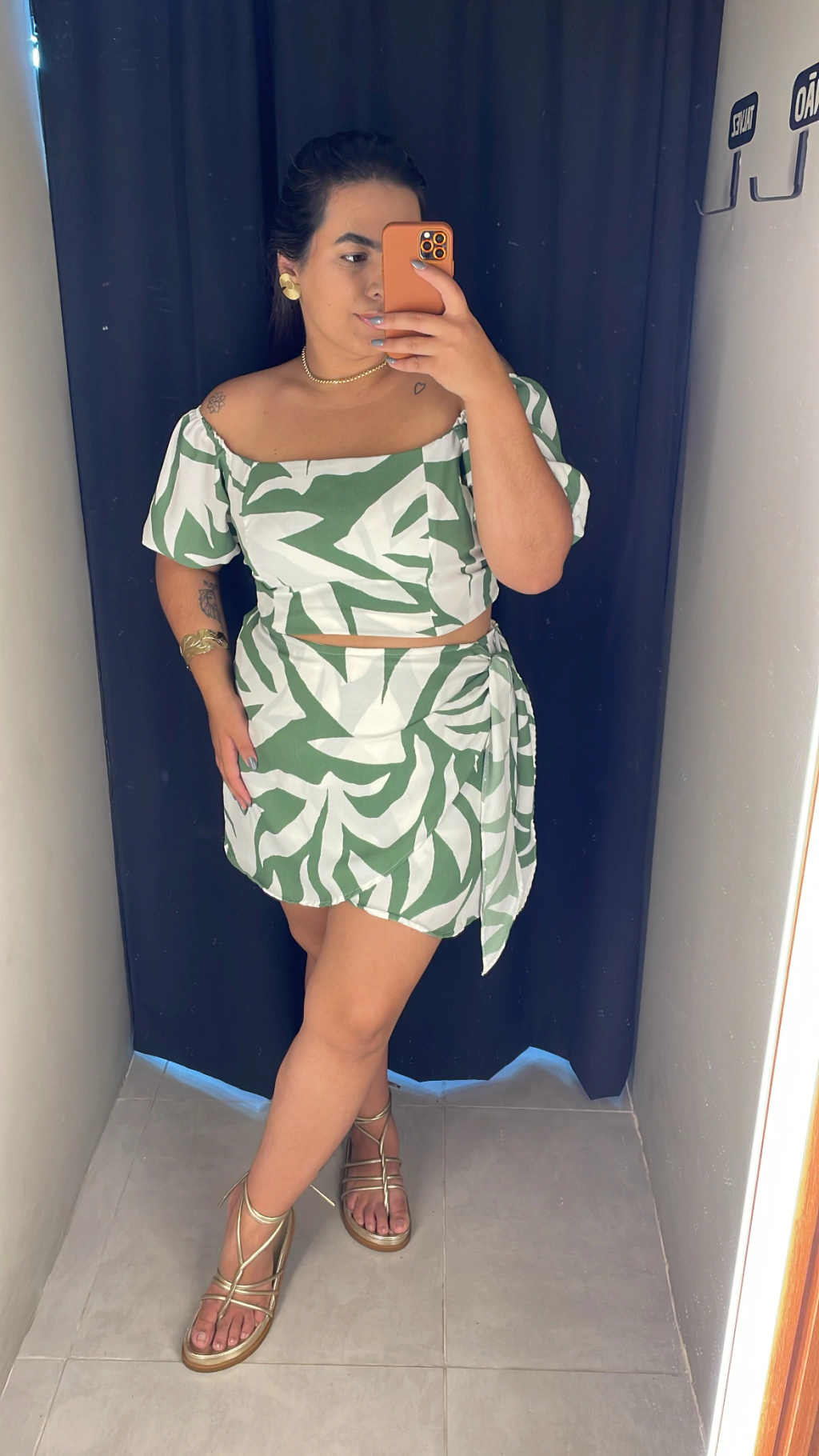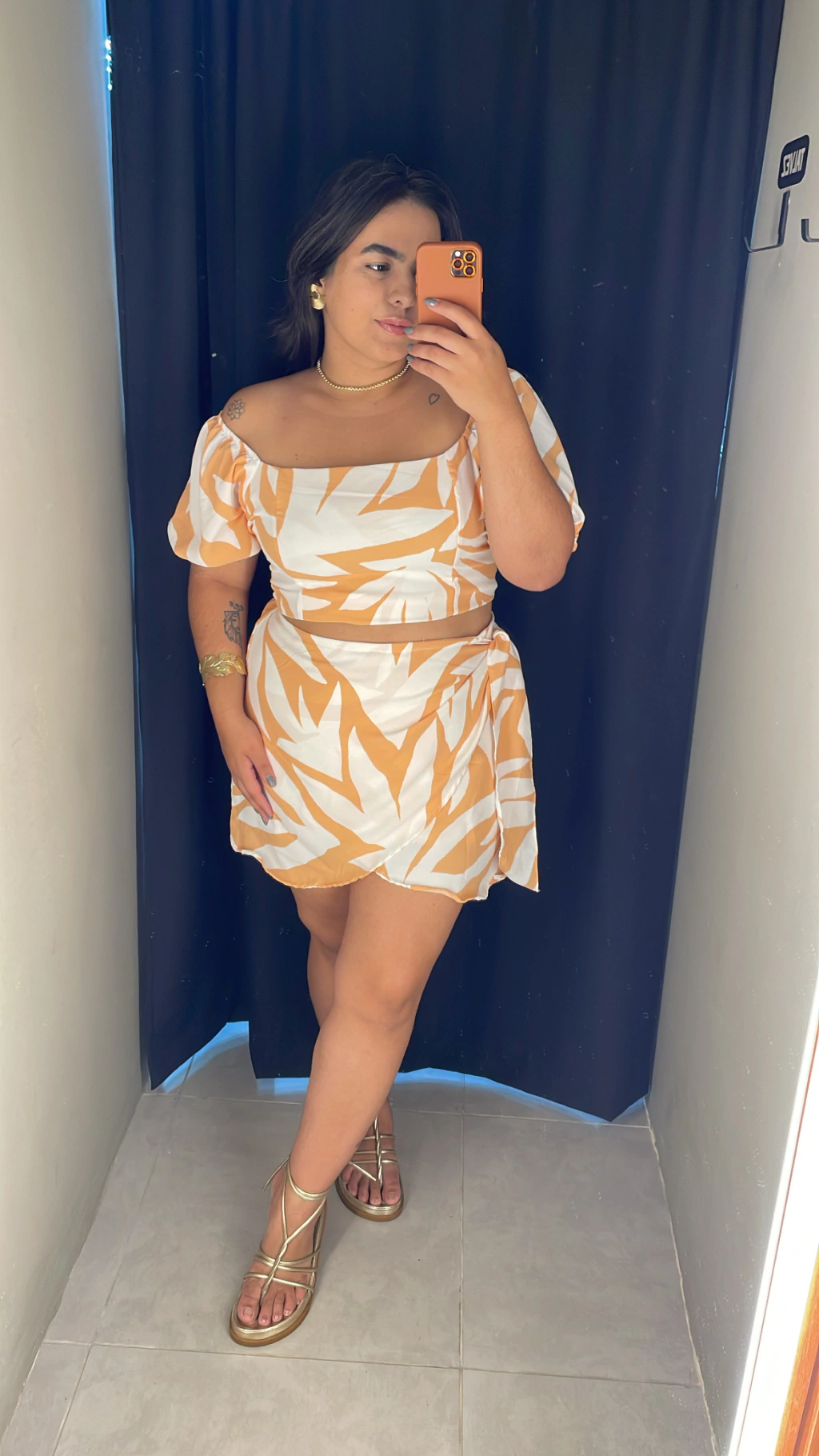 Nosso conjunto de short saia e cropped é confeccionado no tecido de crepinho de seda, não possui elastano, não encolhe e não amarrota. Possui elástico na parte de trás da saia para melhor se adaptar ao corpo, e o croped é de amarrar atrás, sendo ajustável. Está disponível em três numerações, são elas: