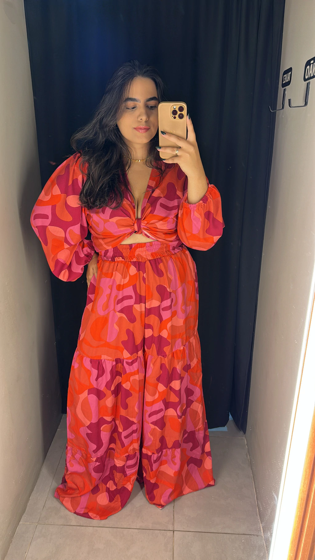Nosso conjunto Amazonas é confeccionado no tecido viscolinho, tem taxa de 4% de encolhimento após a primeira lavagem. A calça é pantalona bem longa e tem 118cm de comprimento, possui bolsos e o cós com elástico. O croped é de amarração, valoriza o busto. Disponível em três tamanhos G1, G2 e G3.