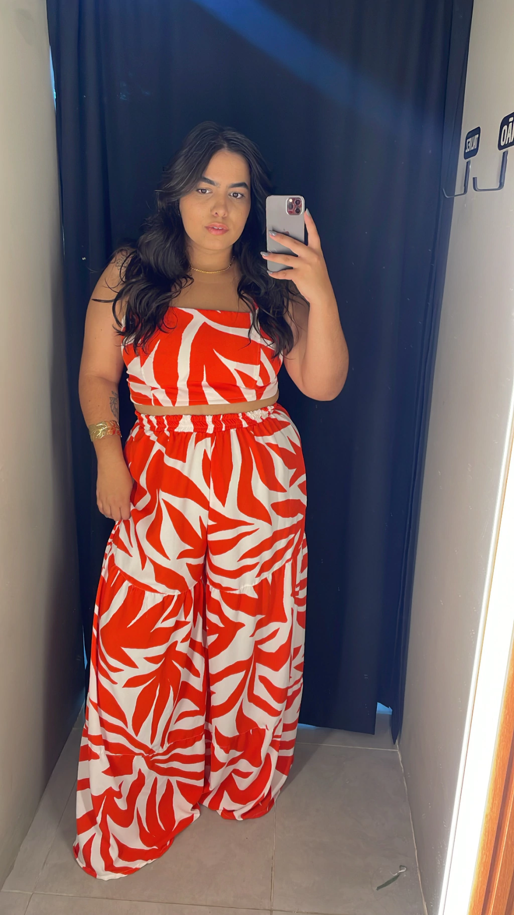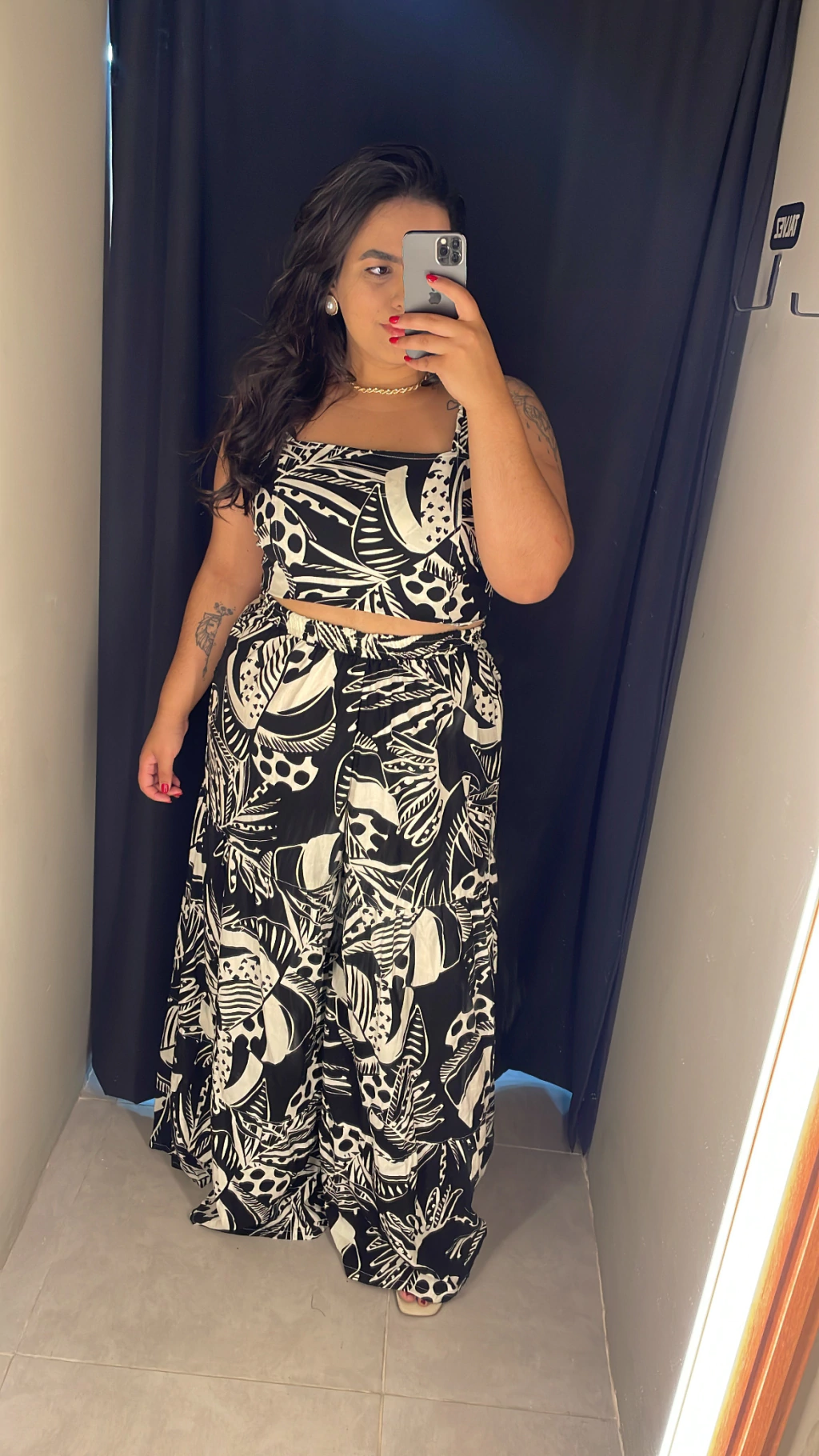 Nosso conjunto Lapa é confeccionado no tecido viscolinho, tem taxa de 4% de encolhimento após a primeira lavagem. A calça é pantalona bem longa e tem 118cm de comprimento, e o cropped tem uma amarração que te permite usar de duas maneiras. Disponível em três tamanhos G1, G2 e G3.