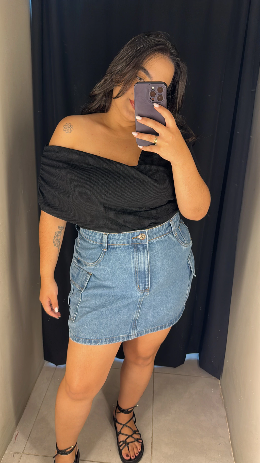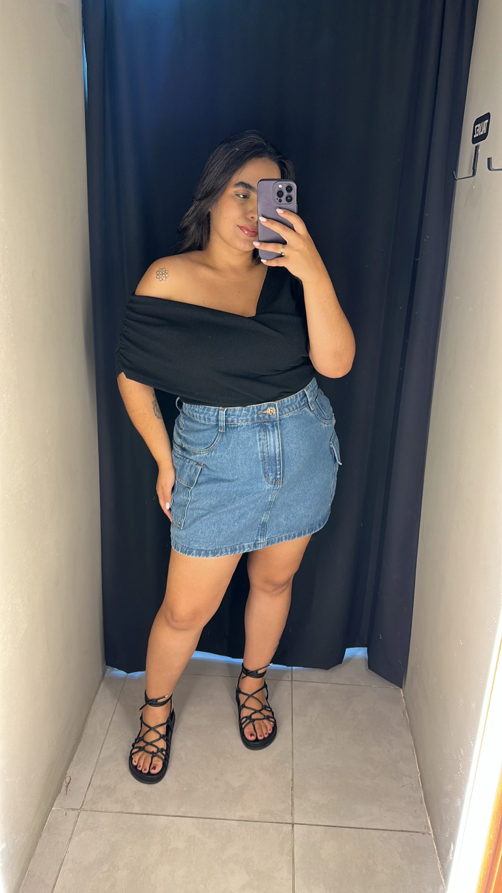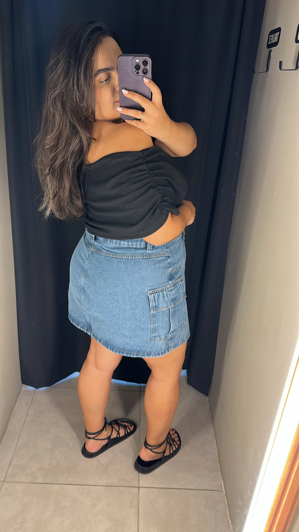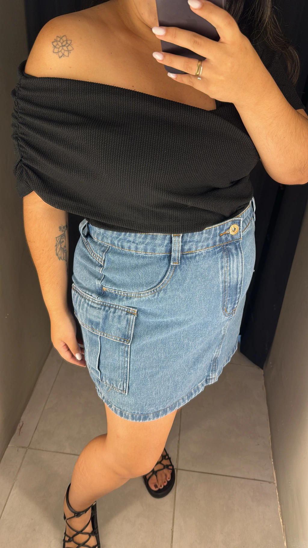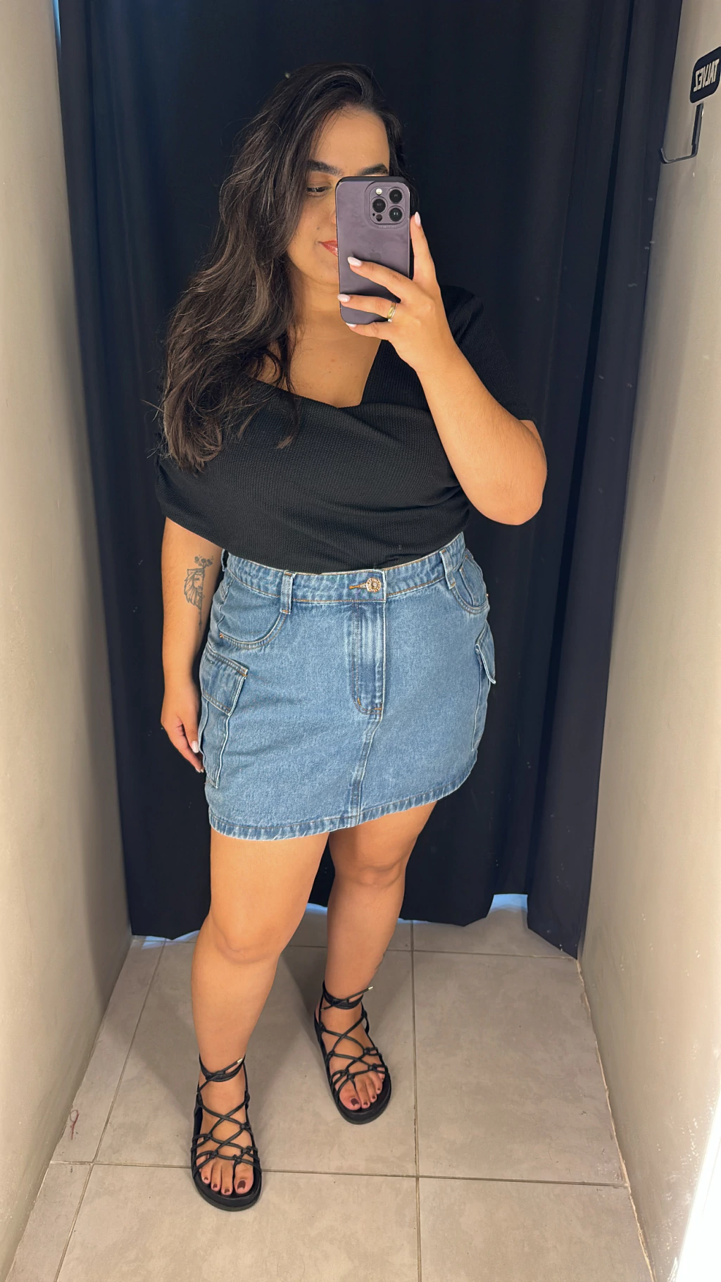 Nossa saia jeans cargo é confeccionada no jeans 100%, não possui elastano. Está disponível nas numerações: