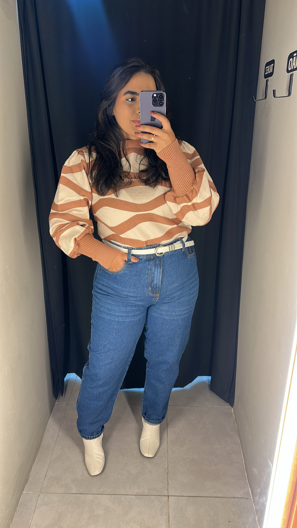 Nosso tricot modal Suíça tem a modelagem moderna e autêntica, com as mangas amplas e o punho ajustado. É tamanho único plus, veste do 46 ao 54.