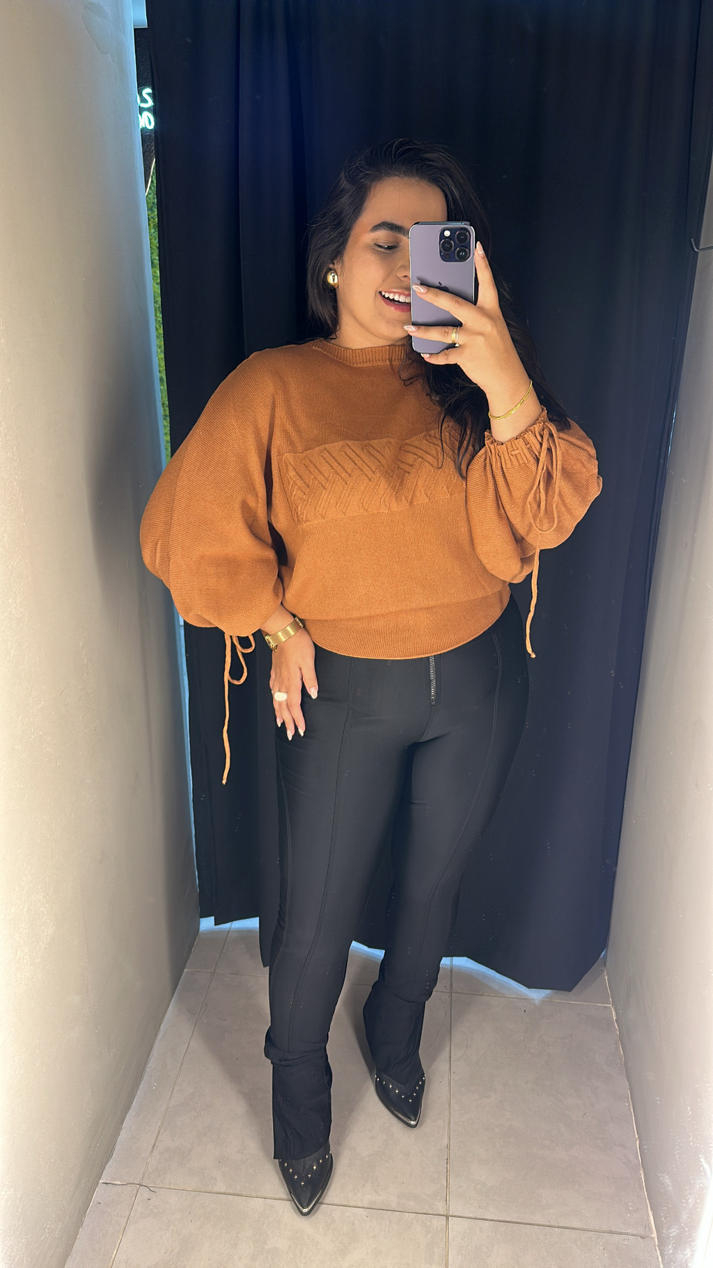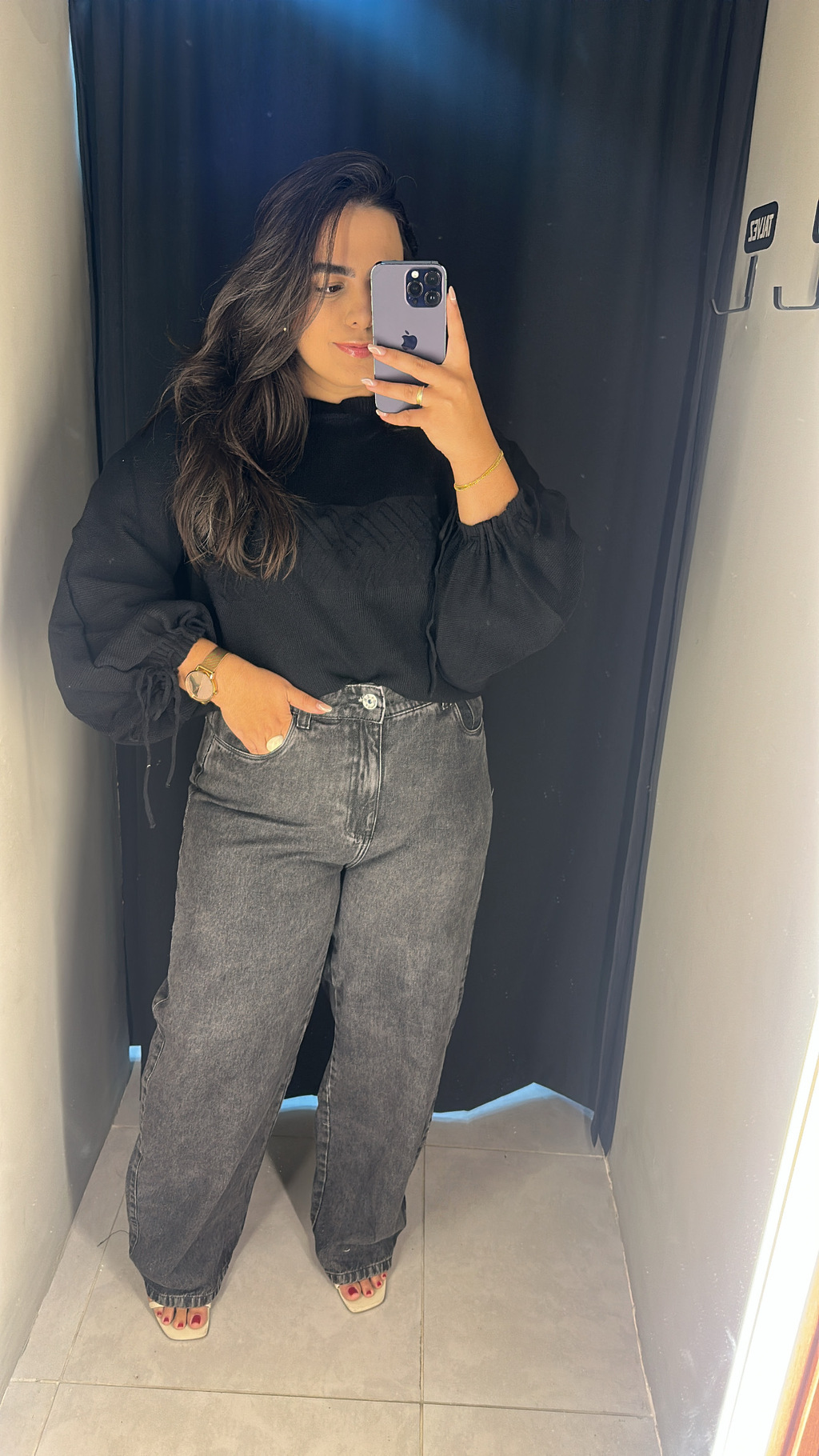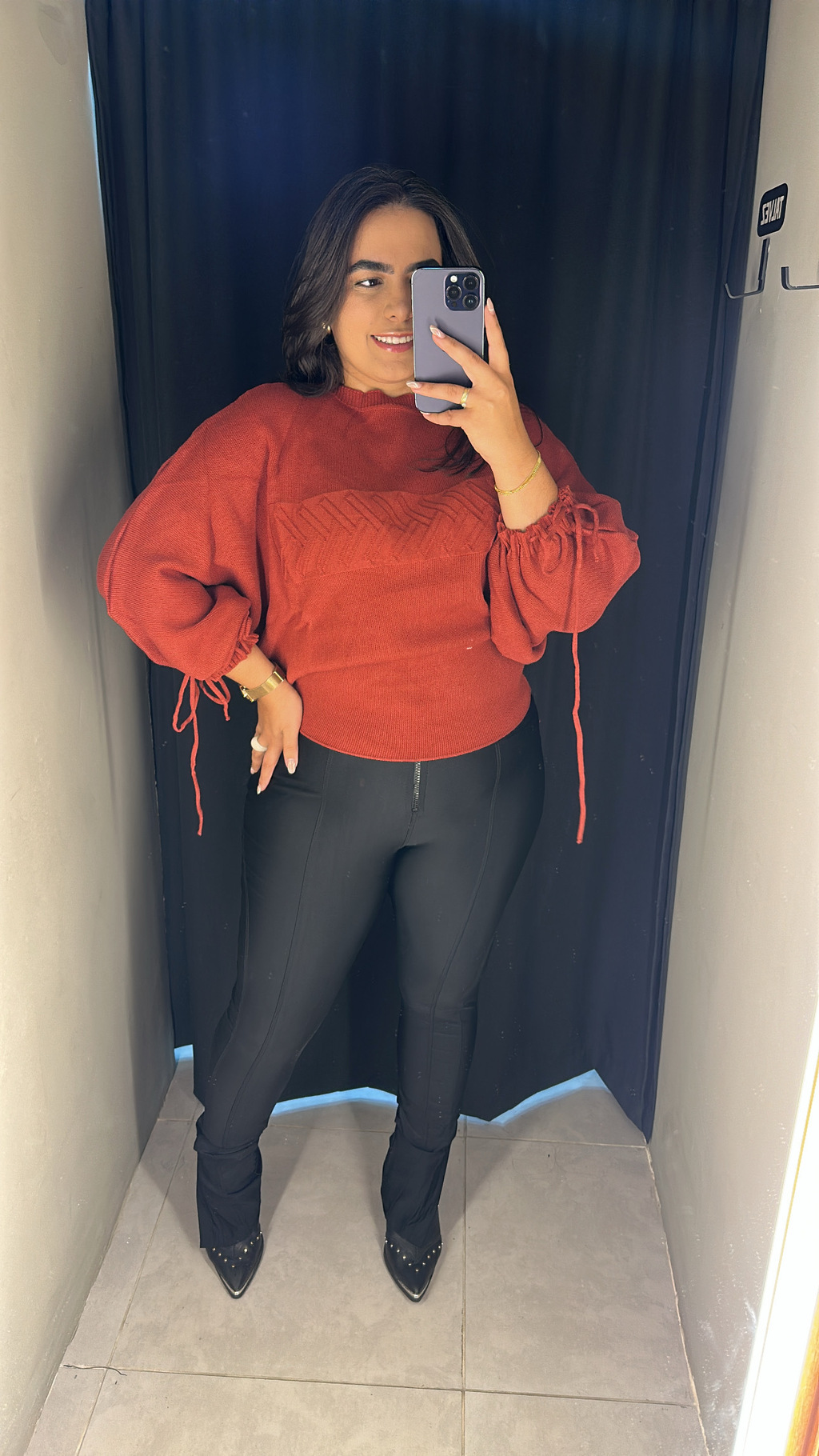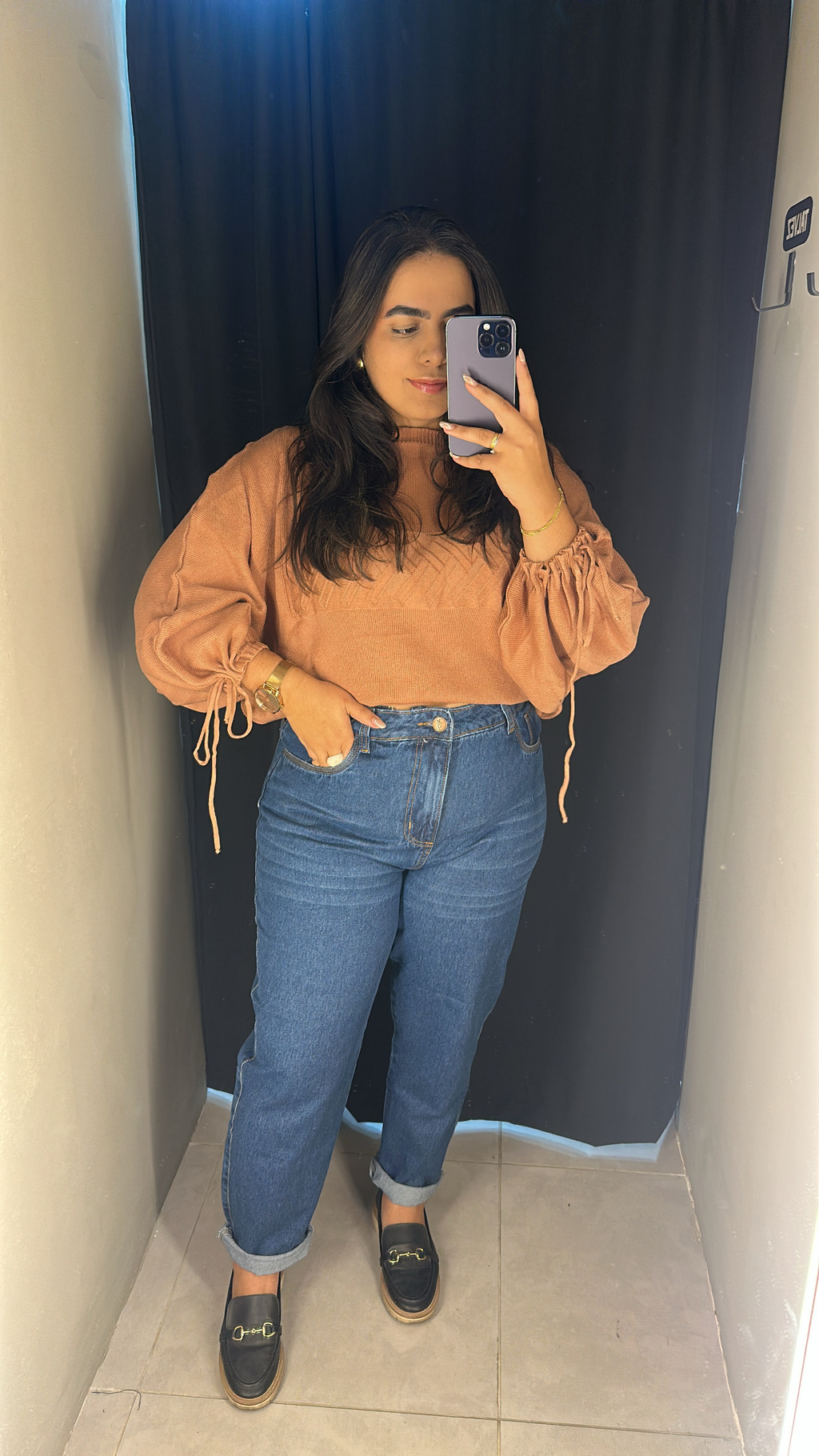 Nosso tricot modal Bruxelas tem a modelagem moderna e autêntica, com as mangas amplas e o ajuste das mangas com amarração. É tamanho único plus, veste do 46 ao 54.